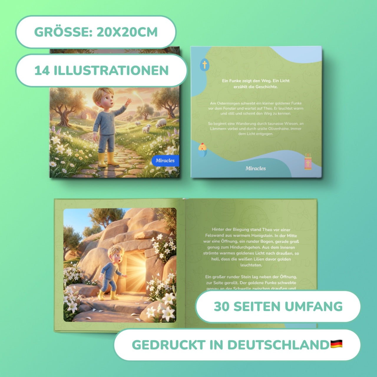 30 pages with 14 unique illustrations. High-quality 140gsm paper, size 8x8 inches. Softcover or hardcover. Printed in US & UK.