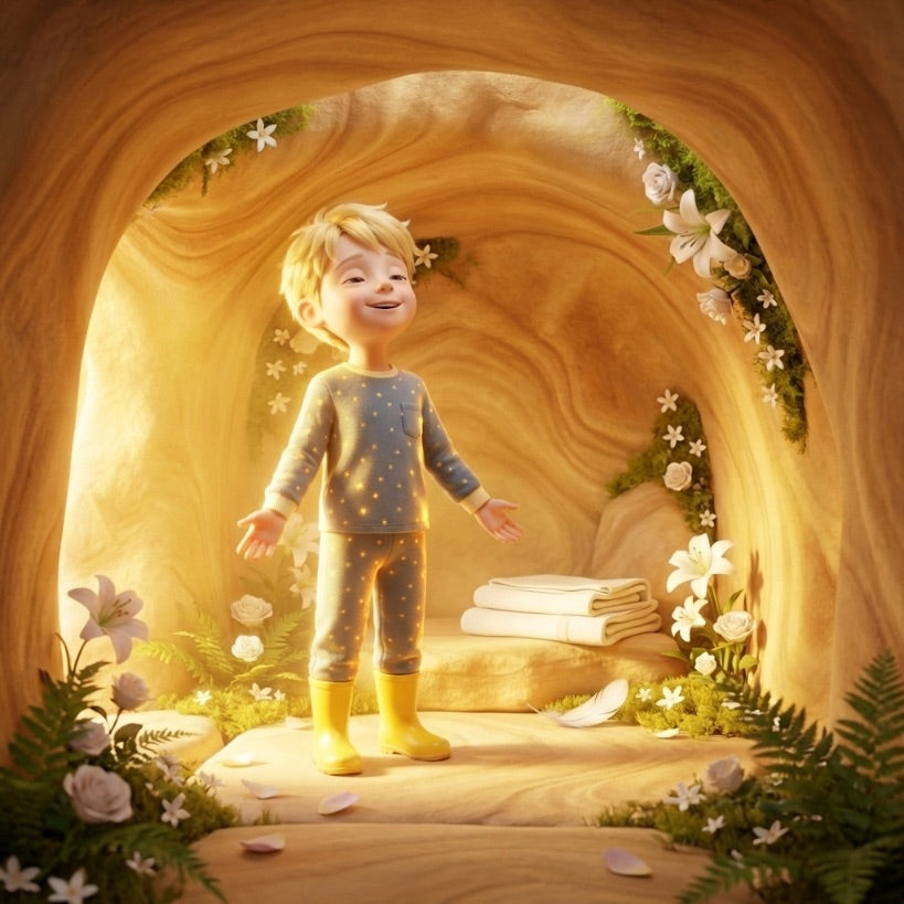 🕊️ At the end of the path, a glowing cave of warm stone awaits — full of light, white flowers, and a silence that tells more than words.