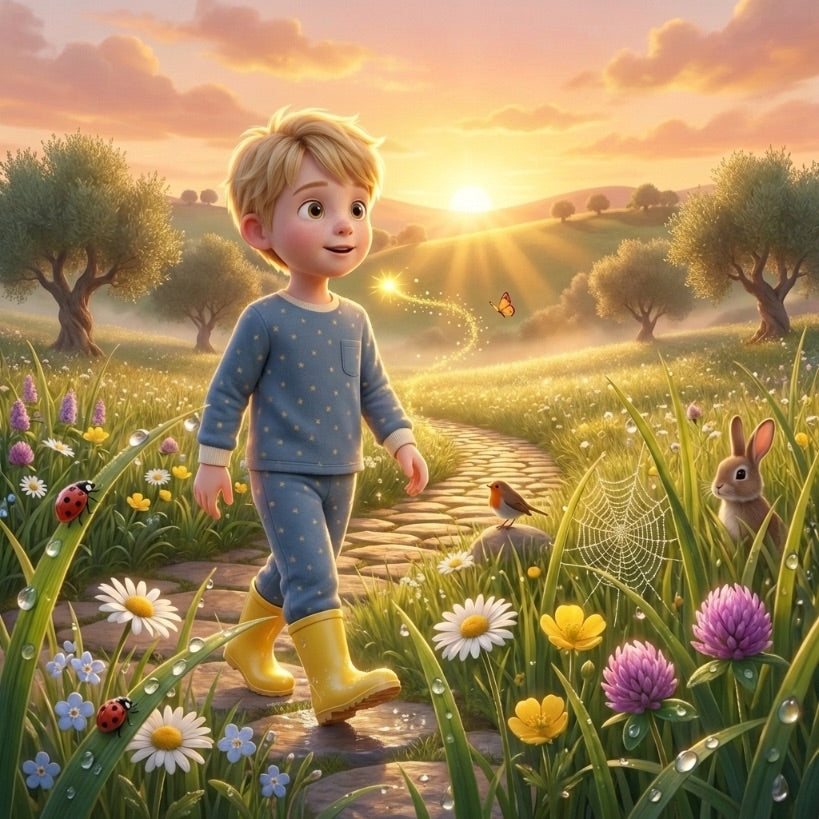 ✨ A golden spark outside the window, before the first light of day — and the beginning of a walk through dew-soaked meadows, flocks of lambs, and ancient olive groves.