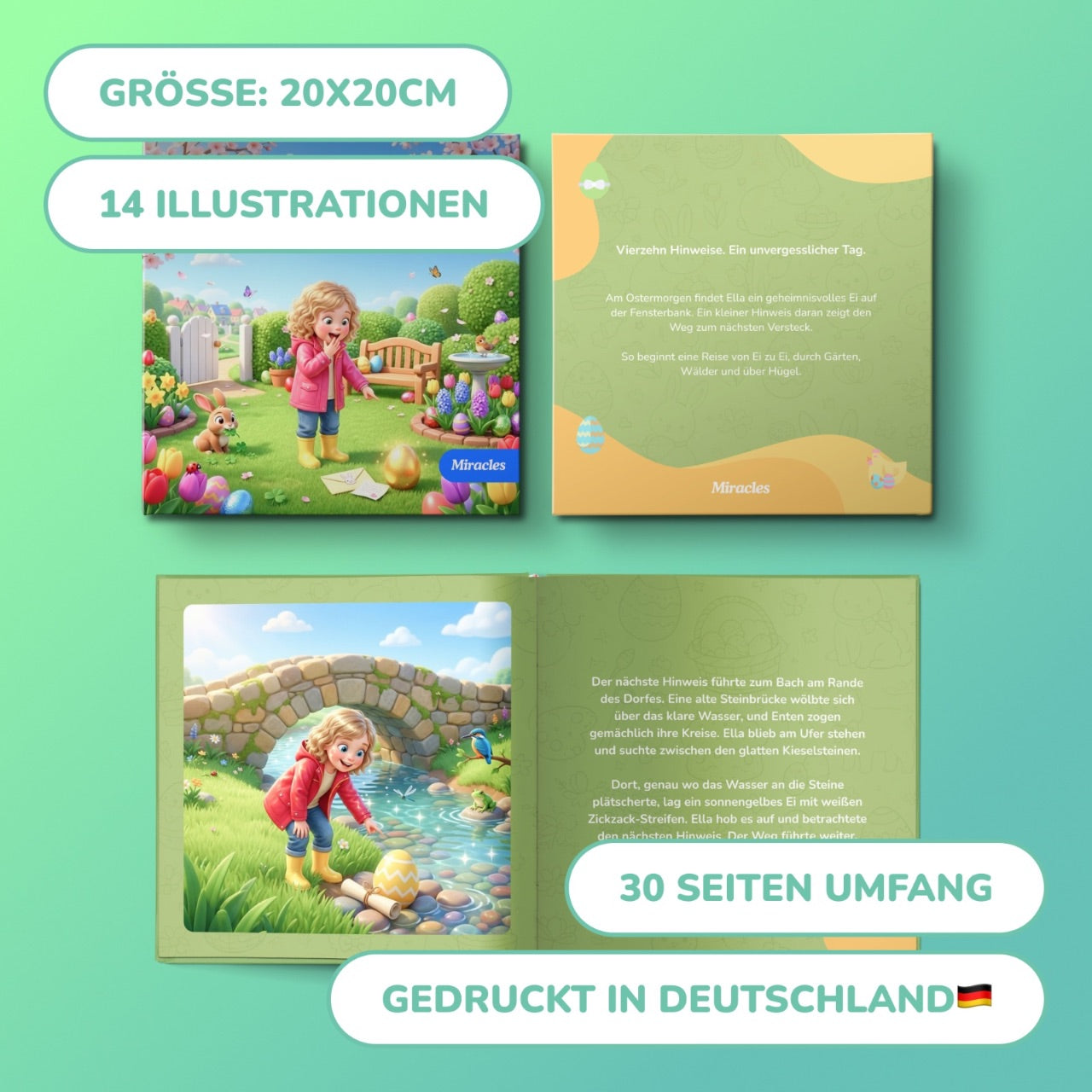 30 stron z 14 indywidualnymi ilustracjami. Wysokiej jakości papier 140 g/m², format 20x20 cm. Miękka lub twarda oprawa. Drukowane w Niemczech.